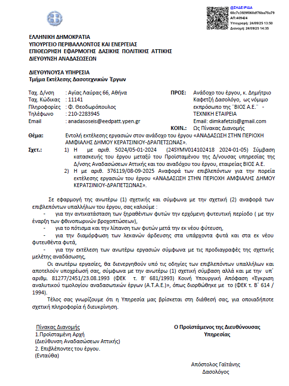 Πιο συγκεκριμένα, στις 8 Οκτωβρίου 2025, η υπηρεσία ενέκρινε την εκ νέου φύτευση και τη διαμόρφωση των θέσεων για τα νέα φυτά, ενώ ζητήθηκε να παρακολουθείται στενά η πρόοδος του έργου από επιβλέποντες δασολόγους.