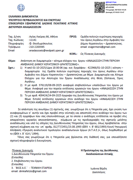 Η Διεύθυνση Αναδασώσεων Αττικής απάντησε επισήμως ότι έχει λάβει γνώση των αναφερόμενων και έχει προχωρήσει στη σύνταξη και αποστολή εντολής για την εκτέλεση συμπληρωματικών εργασιών, όπως αναφέρεται στα σχετικά έγγραφα που έστειλε η υπηρεσία.