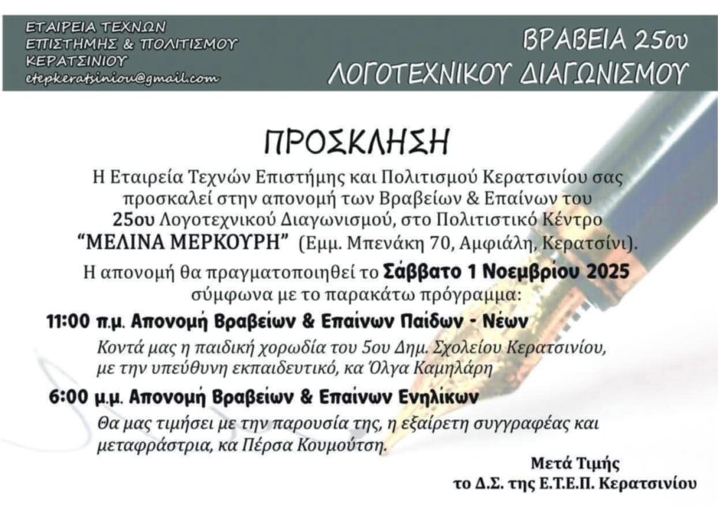 Η Εταιρεία Τεχνών Επιστήμης και Πολιτισμού Κερατσινίου (ΕΤΕΠ Κερατσινίου) προσκαλεί το κοινό στην απονομή Βραβείων και Επαίνων του 25ου Λογοτεχνικού Διαγωνισμού, η οποία θα πραγματοποιηθεί το Σάββατο 1 Νοεμβρίου στο Πολιτιστικό Κέντρο «Μελίνα Μερκούρη», Εμμανουήλ Μπενάκη 70, Αμφιάλη, Κερατσίνι.