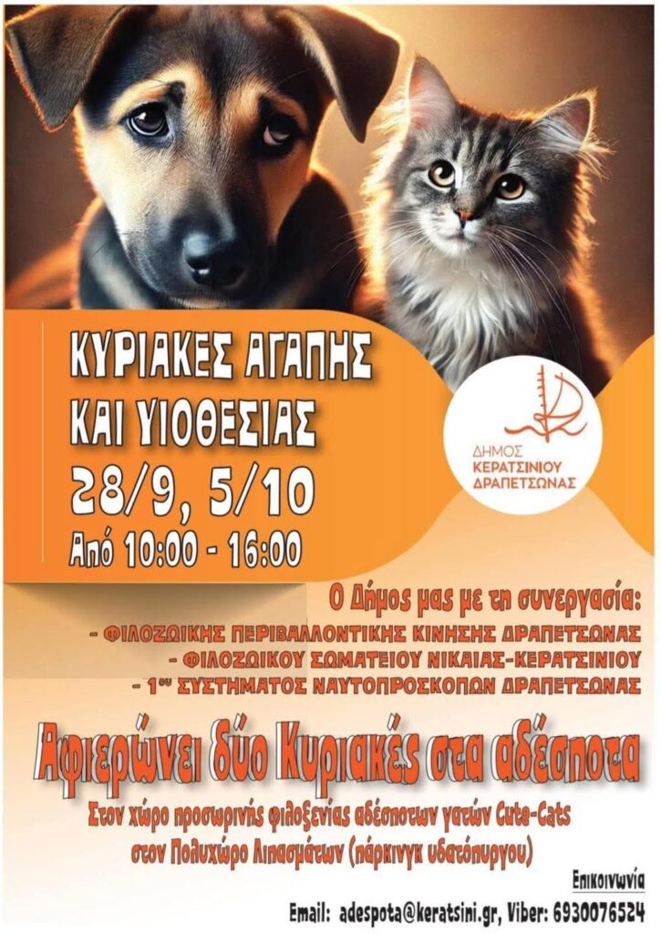 Ο Δήμος Κερατσινίου – Δραπετσώνας συνεχίζει τις Κυριακές Υιοθεσίας Αδέσποτων, διοργανώνοντας τη δεύτερη δράση αυτή την Κυριακή 5 Οκτωβρίου 2025, στον Πολυχώρο Λιπασμάτων, στο πάρκινγκ του υδατόπυργου.