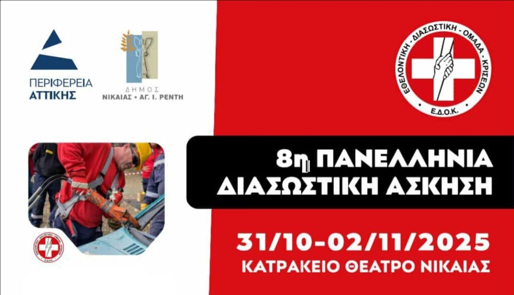 Η Εθελοντική Διασωστική Ομάδα Κρίσεων (Ε.Δ.Ο.Κ.) διοργανώνει την 8η Πανελλήνια Διασωστική Άσκηση, σε συνεργασία με τον Δήμο Νίκαιας – Αγ. Ι. Ρέντη και το Τμήμα Πολιτικής Προστασίας, υπό την αιγίδα της Περιφέρειας Αττικής και με την υποστήριξη του Ελληνικού Διαδημοτικού Δικτύου Υγιών Πόλεων (ΕΔΔΥΠΠΥ) του Παγκόσμιου Οργανισμού Υγείας (Π.Ο.Υ.).