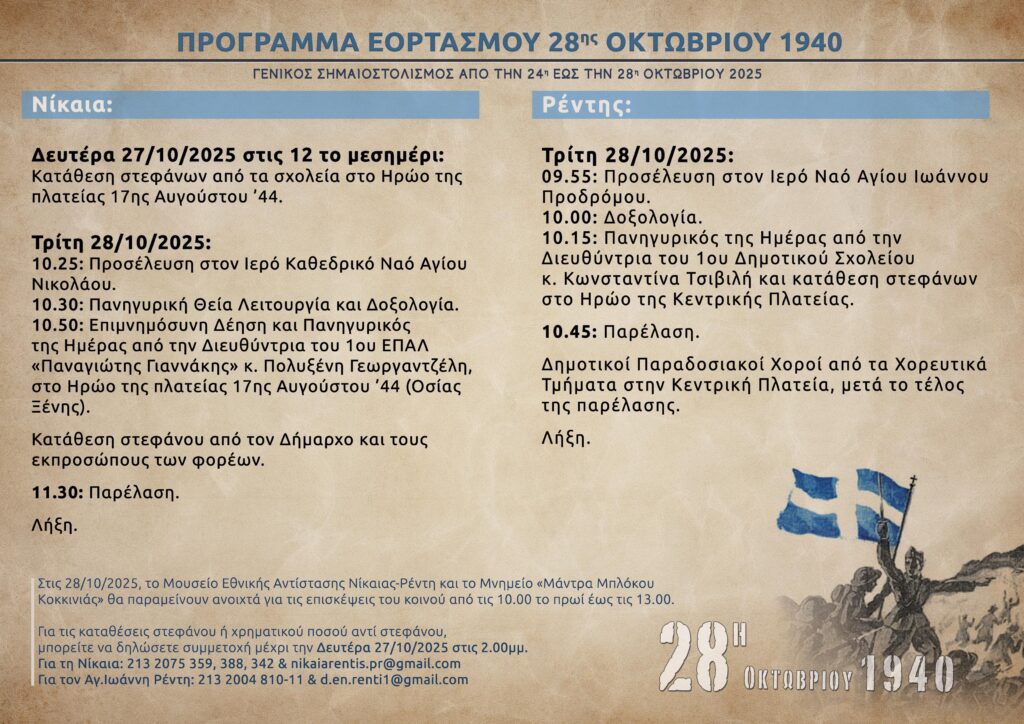 Οι εκδηλώσεις 28ης Οκτωβρίου Νίκαια Ρέντης ξεκινούν τη Δευτέρα 27 Οκτωβρίου 2025, με κατάθεση στεφάνων από μαθητές των σχολείων στο Ηρώο της πλατείας 17ης Αυγούστου ’44, τιμώντας τους ήρωες που αντιστάθηκαν σθεναρά στον φασισμό.