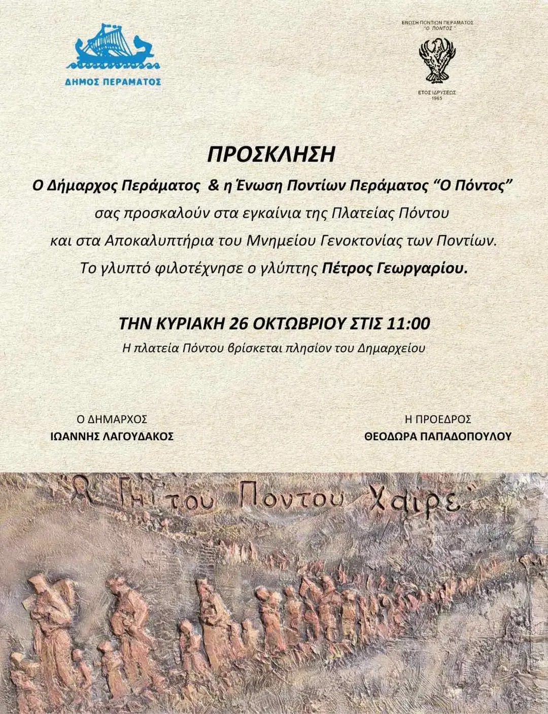 Με μια σεμνή αλλά ιδιαίτερα φορτισμένη τελετή, ο Δήμος Περάματος και η Ένωση Ποντίων Περάματος “Ο Πόντος” πραγματοποιούν την Κυριακή 26 Οκτωβρίου στις 11:00 π.μ. τα εγκαίνια της Πλατείας Πόντου και τα αποκαλυπτήρια του Μνημείου Γενοκτονίας των Ποντίων.