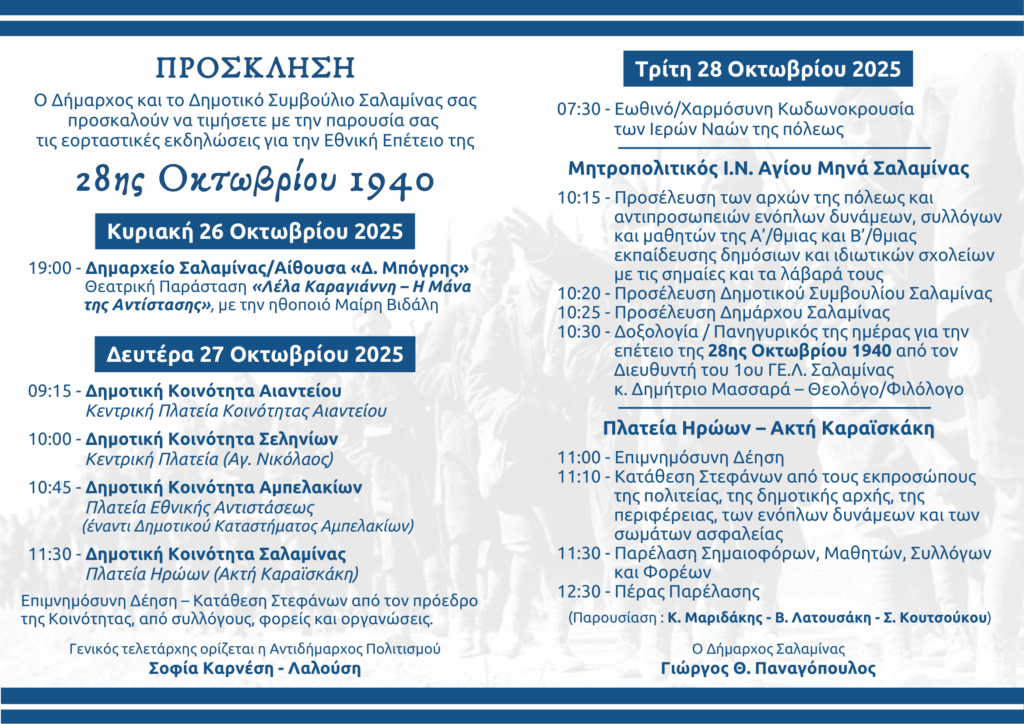 Η 28η Οκτωβρίου 1940 αποτελεί μία από τις πιο εμβληματικές στιγμές της νεότερης ελληνικής ιστορίας και ο Δήμος Σαλαμίνας τιμά την Εθνική Επέτειο με εκδηλώσεις μνήμης, σεβασμού και πατριωτικής υπερηφάνειας.