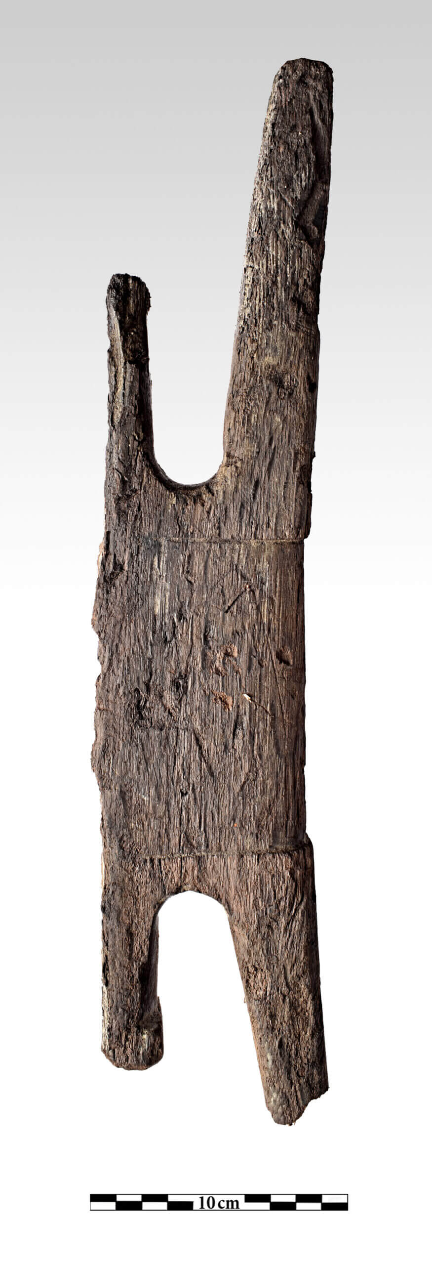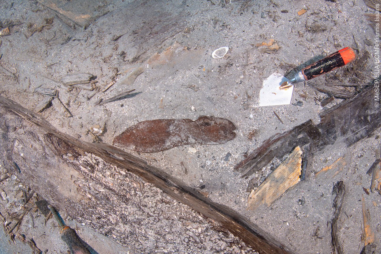 Στον χώρο της τομής εντοπίσθηκαν, όπως και κατά την προηγούμενη ανασκαφική περίοδο το 2019, ένας σημαντικός αριθμός ξύλινων και μεταλλικών αντικειμένων που σχετίζονται κατά κύριο λόγο με τον εξαρτισμό του ενός εκ των δύο ιστών του πλοίου. Ξύλινοι διαμπερείς κύλινδροι που χρησίμευαν για την κύλιση της κεραίας του κεντρικού ιστίου στον ιστό (εικ. 5), ξύλινοι κύλινδροι που απέτρεπαν την περιτύλιξη των σχοινιών (εικ. 6), ξύλινες δέστρες για την πρόσδεση των σχοινιών (εικ. 7), τροχαλίες διαφόρων μεγεθών, μονές ή διπλές (εικ. 8,9), ορισμένες από τις οποίες σώζουν ακόμα τμήματα των σχοινιών πρόσδεσής τους (από το χώρο του ναυαγίου έχουν ανελκυσθεί μέχρι σήμερα 35 τροχαλίες ακέραιες ή τμήματά τους, από συνολικά περίπου τις 120 που απαιτούνται για τον εξαρτισμό ενός πλοίου των διαστάσεων του Μέντορα). Γενικά, από τα αποτελέσματα της έρευνας επιβεβαιώνεται, ότι ο χώρος που ανασκάφθηκε συμπίπτει με τη θέση του ενός εκ των δύο ιστών του πλοίου (ο Μέντωρ ήταν ένα δικάταρτο μπρίκι) και κατά πάσα πιθανότητα του πρυμναίου, αφού ορισμένα από τα ξύλινα εξαρτήματα συνδέονται με τον εξαρτισμό της κεραίας της πρύμνης του πλοίου. Ακόμα κατά τη φετινή έρευνα, δόθηκε η ευκαιρία να ανελκυσθούν και να φωτογραφηθούν τρισδιάστατα, δύο τμήματα νομέων του πλοίου (εικ. 10). Οι νομείς αυτοί, δεν ήταν στη θέση τους και είχαν μετακινηθεί κατά την θραύση του πλοίου, μετά, δε, τη φωτογράφηση επανατοποθετήθηκαν στην τομή.
