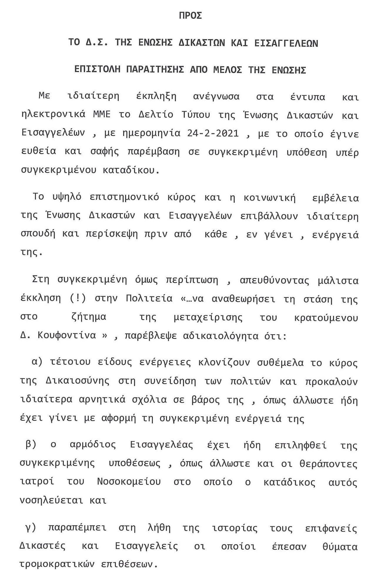 Αναφέρει ότι “με ιδιαίτερη έκπληξη ανέγνωσα στα έντυπα και ηλεκτρονικά ΜΜΕ το Δελτίο Τύπου της Ένωσης Δικαστών και Εισαγγελέων, με ημερομηνία 24-2-2021, με το οποίο έγινε ευθεία παρέμβαση σε συγκεκριμένη υπόθεση υπέρ συγκεκριμένου καταδίκου”. Όπως επισημαίνει ο αντεισαγγελέας, “το υψηλό επιστημονικό κύρος και η κοινωνική εμβέλεια της Ένωσης επιβάλλουν ιδιαίτερη σπουδή και περίσκεψη πριν από κάθε, εν γένει ενέργειά της”.
