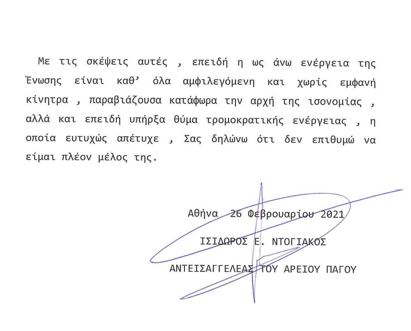 Με την επιστολή παραίτησης προς την Ένωση, ο κ. Ντογιάκος υπογραμμίζει ότι ανάλογες ενέργειες κλονίζουν το κύρος της Δικαιοσύνης, υπενθυμίζοντας ότι κι ο ίδιος υπήρξε θύμα τρομοκρατικής ενέργειας.