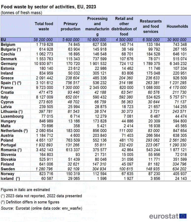 Σύμφωνα με την έκθεση “Food waste και πρόληψή του” της Eurostat, η Ελλάδα σπατάλησε το 2023 2,09 εκατομμύρια τόνους τροφίμων. Το 2022 η ποσότητα ήταν 196 κιλά ανά κάτοικο, ενώ το 2020 ήταν 191 — δηλαδή μέσα σε τρία χρόνια η σπατάλη αυξήθηκε κατά περίπου 5%.