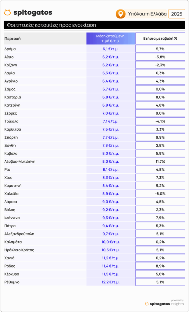 Οι χαμηλότερες μέσες ζητούμενες τιμές ενοικίασης φοιτητικών κατοικιών (κάτω των 7,0 €/τ.μ.) σημειώνονται και πάλι σε Δράμα, Αίγιο, Κοζάνη, Λαμία, Αγρίνιο, Σάμο, Καστοριά και Κατερίνη. Στον αντίποδα, οι υψηλότερες μέσες ζητούμενες τιμές ενοικίασης φοιτητικών κατοικιών (άνω των 9,0 €/τ.μ.) εντοπίζονται σε Λάρισα, Βόλο, Ιωάννινα, Πάτρα, Αλεξανδρούπολη και Καλαμάτα. Οι πιο υψηλές ΜΖΤ ενοικίασης φοιτητικών κατοικιών εντοπίζονται και πάλι σε περιοχές με έντονη τουριστική δραστηριότητα όπως το Ηράκλειο Κρήτης, τα Χανιά, η Ρόδος, η Κέρκυρα και το Ρέθυμνο όπως φαίνεται στον παρακάτω πίνακα.