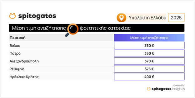Όσον φορά τη ζήτηση, η μέση τιμή αναζήτησης φοιτητικής κατοικίας στον Βόλο ανέρχεται στα 350 €, στην Πάτρα στα 360 €, στην Αλεξανδρούπολη στα 370 €, ενώ σε Ρέθυμνο και Ηράκλειο Κρήτης η μέση τιμή αναζήτησης φοιτητικού σπιτιού ανέρχεται στα 375 € και 400 € αντίστοιχα.
