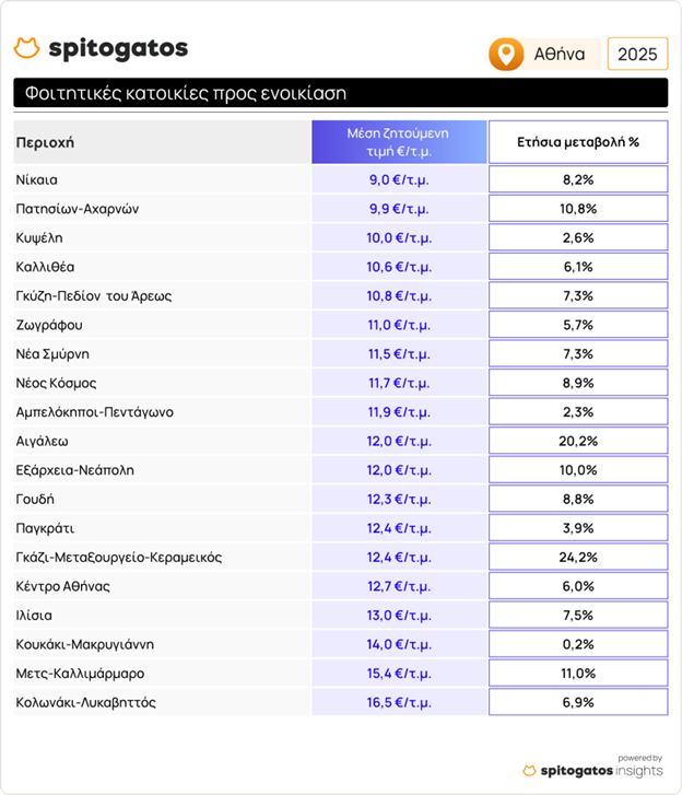 Σύμφωνα με τα στοιχεία του Spitogatos Insights, οι μέσες ζητούμενες τιμές (ΜΖΤ) ενοικίασης φοιτητικών κατοικιών σε όλη τη χώρα κατέγραψαν άνοδο της τάξης του 6,6% κατά την περίοδο Ιουλίου-Αυγούστου 2025, σε σύγκριση με την αντίστοιχη περίοδο του 2024. Στην Αττική, οι περισσότερες φοιτητικές περιοχές κατέγραψαν αυξήσεις, με τις υψηλότερες ζητούμενες τιμές ενοικίασης να εντοπίζονται σε Κολωνάκι–Λυκαβηττό και Μετς–Καλλιμάρμαρο, ενώ οι χαμηλότερες καταγράφονται στη Νίκαια και στην περιοχή Πατησίων–Αχαρνών, όπως φαίνεται χαρακτηριστικά στον παρακάτω πίνακα. Σημαντικές ετήσιες αυξήσεις στις μέσες ζητούμενες τιμές ενοικίασης φοιτητικής κατοικίας στην Αττική σημειώνονται στις περιοχές: Γκάζι-Μεταξουργείο-Κεραμεικός, Αιγάλεω, Μετς-Καλλιμάρμαρο και Πατησίων-Αχαρνών.