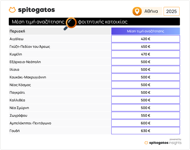 Σε ό,τι αφορά τη ζήτηση για φοιτητικές κατοικίες, το Spitogatos Insights ανέλυσε τις τιμές αναζήτησης χρηστών για φοιτητικά σπίτια προς ενοικίαση και παρουσιάζει την μέση τιμή αναζήτησης φοιτητικής κατοικίας σε διάφορες περιοχές της Αττικής. Οι ενδιαφερόμενοι για φοιτητική κατοικία κοντά στην Πανεπιστημιούπολη και την Πολυτεχνειούπολη, αναζητούν φοιτητικό σπίτι γύρω στα 550€ στου Ζωγράφου, στα Ιλίσια αναζητούν σπίτι στα 500€ και στην περιοχή Γουδή στα 630€. Η μέση τιμή αναζήτησης σε περιοχές κοντά στο Οικονομικό Πανεπιστήμιο Αθηνών στην περιοχή Εξάρχεια-Νεάπολη ανέρχεται στα 500€, στην Κυψέλη στα 470€, ενώ στην περιοχή Γκύζη-Πεδίον του Άρεως στα 450€.