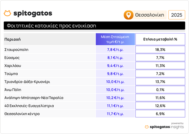 Η ανοδική πορεία των μέσων ζητούμενων τιμών φοιτητικών κατοικιών συνεχίστηκε σε πολλές περιοχές της Θεσσαλονίκης κατά την περίοδο έντονης ζήτησης (Ιούλιος-Αύγουστος 2025), σε σχέση με την αντίστοιχη περσινή. Σημαντικές ετήσιες αυξήσεις καταγράφηκαν στη Σταυρούπολη και στην περιοχή Τριανδρία–Δόξα–Κρυονέρι όπου η ΜΖΤ ενοικίασης φοιτητικής κατοικίας διαμορφώθηκε στα 10,0 €/τ.μ. η οποία είναι αυξημένη κατά 13,7% σε σχέση με την ίδια περίοδο το προηγούμενο έτος. Οι πιο οικονομικές επιλογές φοιτητικής στέγης εξακολουθούν να εντοπίζονται στη Σταυρούπολη και στον Εύοσμο, με τη Σταυρούπολη ωστόσο να παρουσιάζει αύξηση 18,3% σε σχέση με την περίοδο Ιουλίου-Αυγούστου 2024. Αντίθετα, οι πιο ακριβές επιλογές συναντώνται στο κέντρο της Θεσσαλονίκης και στην περιοχή 40 Εκκλησιές–Ευαγγελίστρια, όπου οι ΜΖΤ ενοικίασης φοιτητικών κατοικιών ενισχύθηκαν κατά 12,6% σε ετήσια βάση.