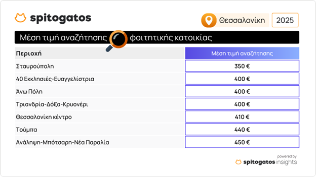 Στην πλευρά της ζήτησης, ενδιαφερόμενοι γονείς και φοιτητές αναζητούν φοιτητική κατοικία προς ενοικίαση από 350€. μέχρι 400€. σε περιοχές όπως η Σταυρούπολη που σημειώνει και τις πιο χαμηλές ζητούμενες τιμές ενοικίασης φοιτητικής κατοικίας, η περιοχή 40 Εκκλησιές-Ευαγγελίστρια αλλά και η Άνω Πόλη όπως φαίνεται και στον παρακάτω πίνακα. Η μέση τιμή αναζήτησης φοιτητικής κατοικίας σε περιοχές όπως η Τούμπα και η Ανάληψη-Μπότσαρη-Νέα Παραλία ανέρχεται στα 440€ και 450€  αντίστοιχα. Στο κέντρο της Θεσσαλονίκης, γονείς και φοιτητές αναζητούν φοιτητική κατοικία γύρω στα 410€.
