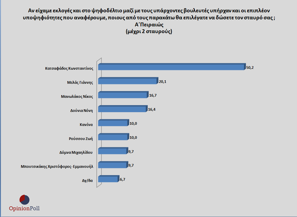 Στο ερώτημα αν είχαμε εκλογές και στο ψηφοδέλτιο μαζί με τους υπάρχοντες βουλευτές υπήρχαν και οι επιπλέον υποψηφιότητες που αναφέρουμε, ποιους από τους παρακάτω θα επιλέγατε να δώσετε τον σταυρό σας, απόλυτα κυρίαρχος στην Α Πειραιά είναι ο Κωνσταντίνος Κατσαφάδος και στην Β Πειραιά ο Δημήτρης Μαρκόπουλος.