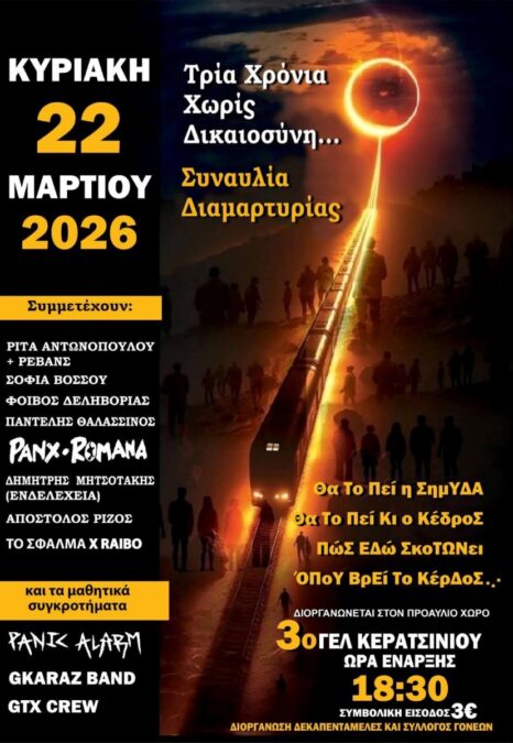 • Η συναυλία για τα Τέμπη στο Κερατσίνι επιστρέφει για δεύτερη χρονιά, με τους μαθητές του 3ου Λυκείου να στέλνουν ηχηρό μήνυμα μνήμης και ευαισθητοποίησης.