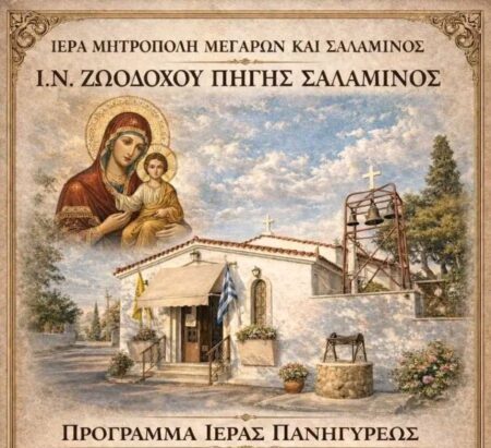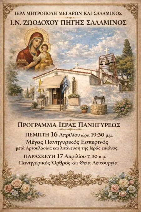 - Σε πανηγυρικό κλίμα θα τιμηθεί η Ζωοδόχος Πηγή στη Σαλαμίνα, με τον Ιερό Ναό να ανακοινώνει το πρόγραμμα των εορταστικών εκδηλώσεων για τις 16 και 17 Απριλίου, καλώντας τους πιστούς να συμμετάσχουν στις λατρευτικές εκδηλώσεις.