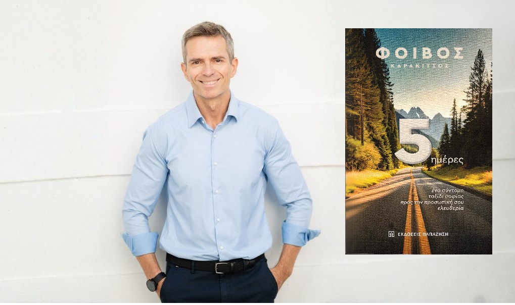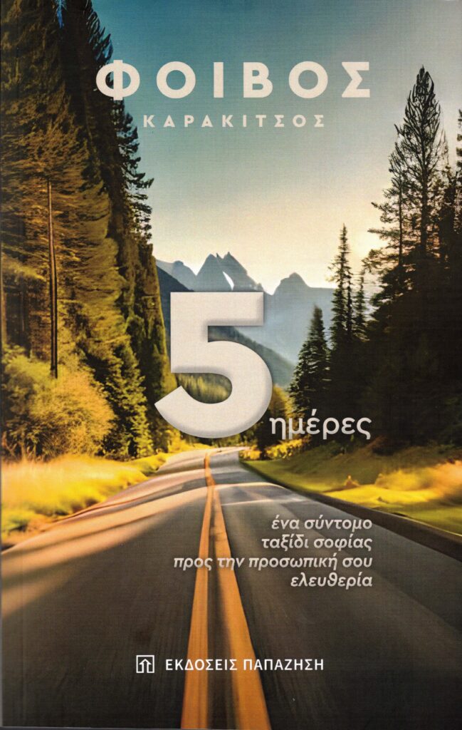 Κυκλοφόρησε από τις Εκδόσεις Παπαζήση το νέο βιβλίο του Φοίβου Καρακίτσου με τίτλο «5 ημέρες: Ένα σύντομο ταξίδι σοφίας προς την προσωπική σου ελευθερία», ένα έργο που επιχειρεί να καθοδηγήσει τον αναγνώστη στη βαθιά διερεύνηση του εαυτού, μέσα από ένα σύντομο αλλά ουσιαστικό ενδοσκοπικό «ταξίδι» πέντε ημερών. Με 318 σελίδες και τιμή 22 ευρώ, το βιβλίο επιχειρεί να απαντήσει σε ένα από τα πιο καίρια ερωτήματα της εποχής μας: πώς μπορεί κανείς να απελευθερωθεί από φόβους, άγχη, ταυτίσεις και νοητικά δεσμά που τον κρατούν μακριά από τον αληθινό εαυτό του.