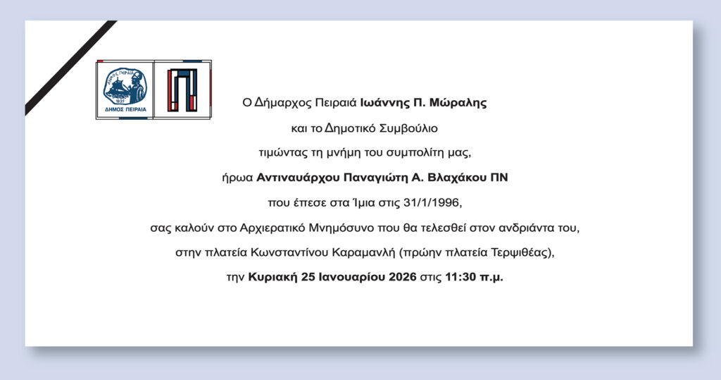 - Ο Δήμος Πειραιά διοργανώνει μνημόσυνο για τον Αντιναύαρχο Παναγιώτη Βλαχάκο στις 25 Ιανουαρίου 2026 στην πλατεία Καραμανλή.