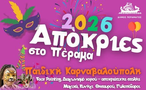 Παράλληλα, οι καρναβαλικές δράσεις του Δήμου Περάματος ξεκινούν από σήμερα, Παρασκευή 13 Φεβρουαρίου, με ένα μεγάλο παιδικό αποκριάτικο πάρτι στο Δημαρχείο.