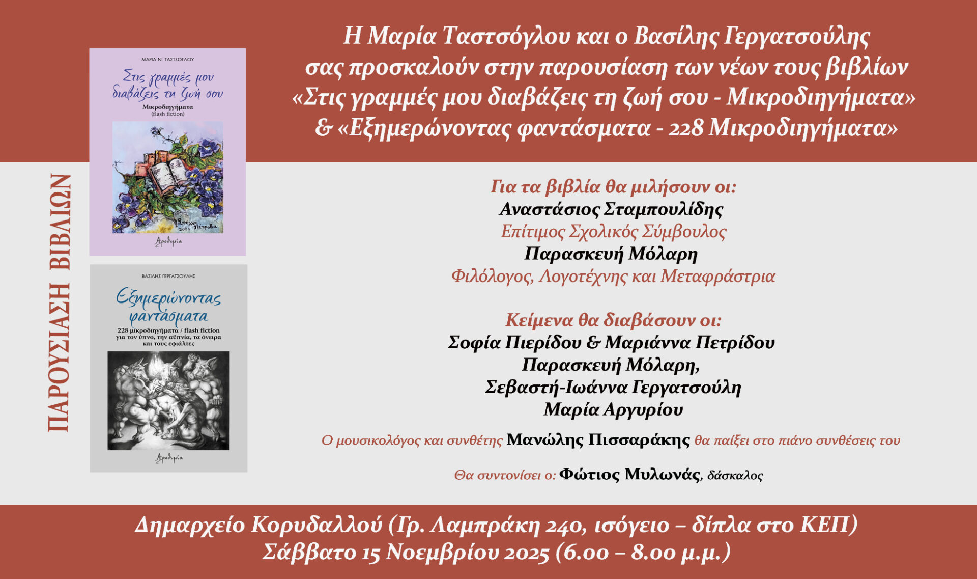 Δύο ξεχωριστές συλλογές μικροδιηγημάτων παρουσιάζονται το Σάββατο 15 Νοεμβρίου στο Δημαρχείο Κορυδαλλού, με μουσική, ανάγνωση και τιμητικές συμμετοχές.