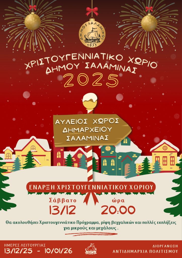 - Ο Δήμος Σαλαμίνας υποδέχεται και φέτος τη μαγεία των Χριστουγέννων με την επιστροφή του Χριστουγεννιάτικου Χωριού, το οποίο θα λειτουργήσει από τις 13 Δεκεμβρίου 2025 έως τις 10 Ιανουαρίου 2026 στον αύλειο χώρο του Δημαρχείου Σαλαμίνας.