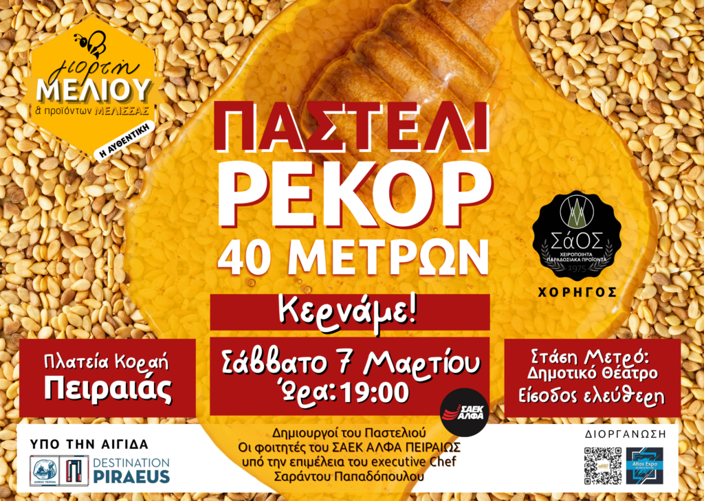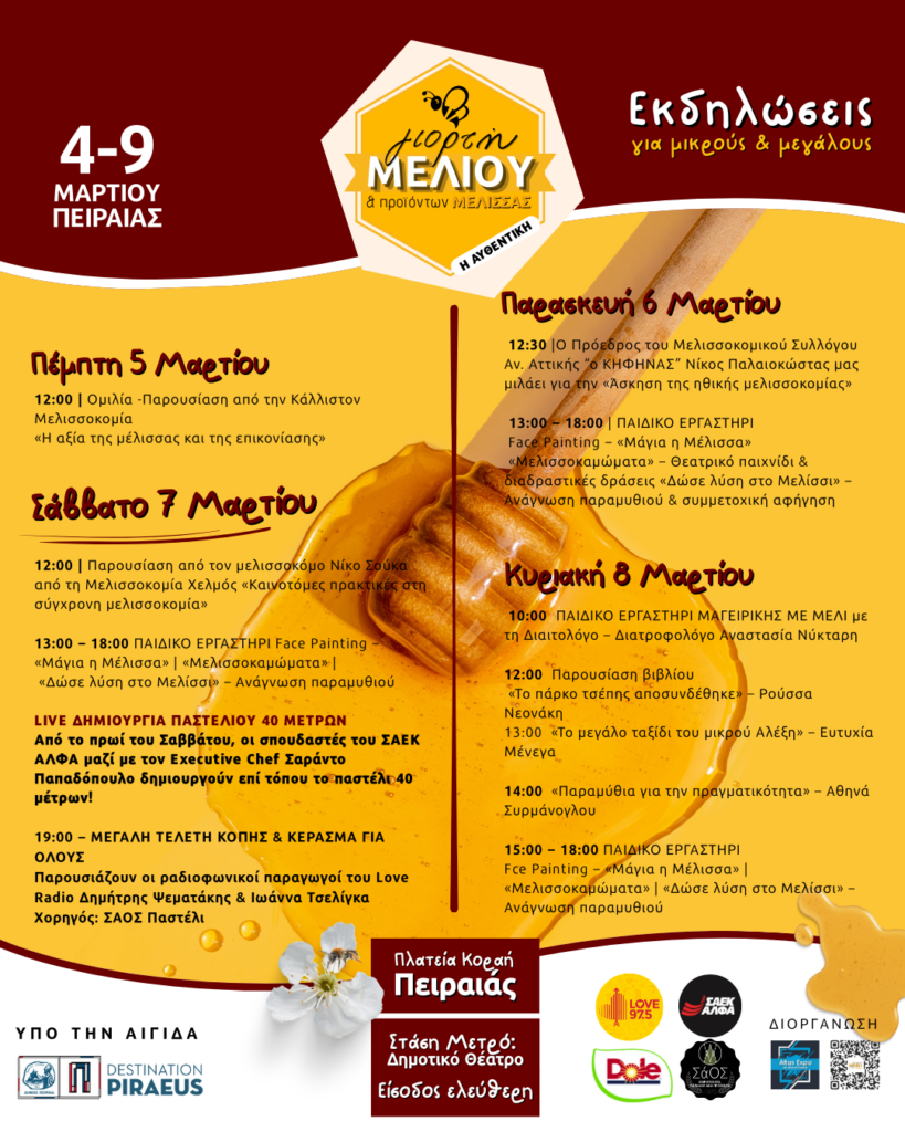 - Η Αυθεντική Γιορτή Μελιού στον Πειραιά επιστρέφει δυναμικά από τις 4 έως τις 9 Μαρτίου στην Πλατεία Κοραή, μετατρέποντας το κέντρο της πόλης σε σημείο συνάντησης της ελληνικής μελισσοκομίας.