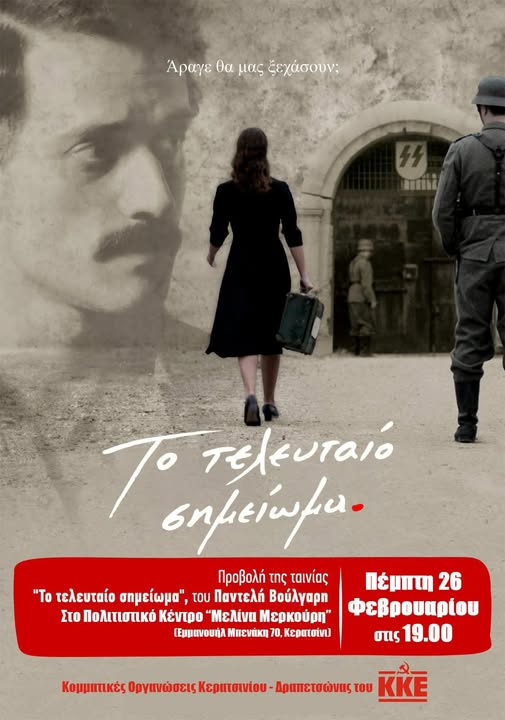 Οι Κομματικές Οργανώσεις Κερατσινίου – Δραπετσώνας του ΚΚΕ και οι Οργανώσεις Βάσης της ΚΝΕ στο Κερατσίνι διοργανώνουν προβολή της ταινίας «Το τελευταίο σημείωμα» του Παντελή Βούλγαρη, με αφορμή τα πρόσφατα ιστορικά ντοκουμέντα που ήρθαν στο φως και αφορούν την εκτέλεση των 200 κομμουνιστών στην Καισαριανή την Πρωτομαγιά του 1944.