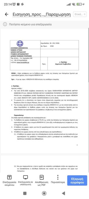 • Σοβαρές αιχμές για δωρεάν παραχώρηση δημοτικού χώρου σε ιδιωτική εταιρεία αφήνει δημοτικός σύμβουλος Κορυδαλλού, καταγγέλλοντας έλλειψη διαφάνειας.