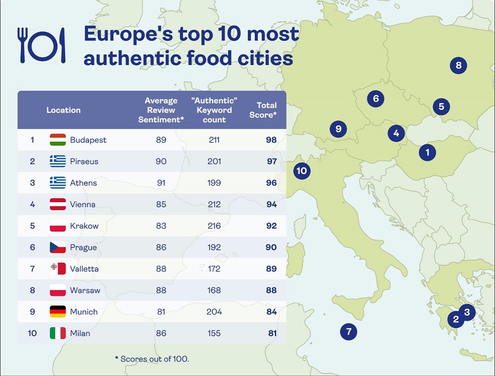 Στην κορυφή βρίσκεται η Βουδαπέστη, ενώ ακολουθούν ο Πειραιάς και η Αθήνα, αφήνοντας πίσω μεγάλους προορισμούς όπως η Βιέννη και η Κρακοβία. Η έρευνα αξιολόγησε τη συχνότητα εμφάνισης όρων όπως «authentic» και «traditional» στις κριτικές Google, την εμπειρία του φαγητού, καθώς και τη συνολική θετική εικόνα των επισκεπτών για κάθε πόλη. Ο Πειραιάς ξεχώρισε χάρη στη βαθιά του σχέση με τη θάλασσα, τη μακραίωνη γαστρονομική του παράδοση και τις αυθεντικές γεύσεις που προσφέρουν οι επαγγελματίες της πόλης.