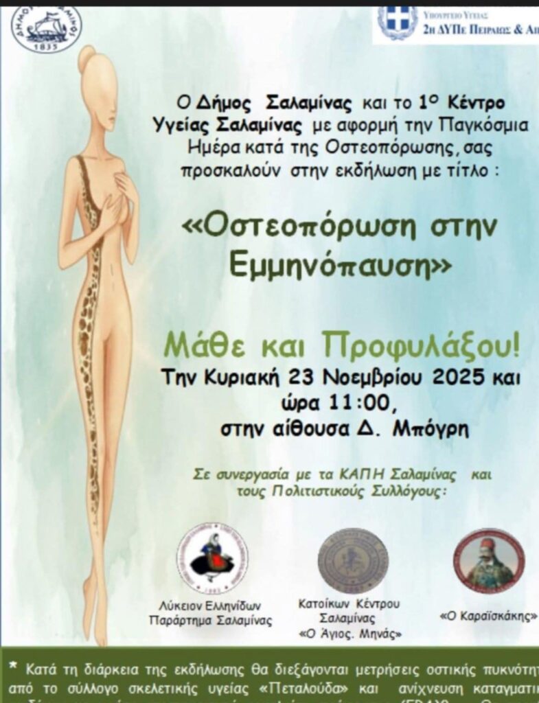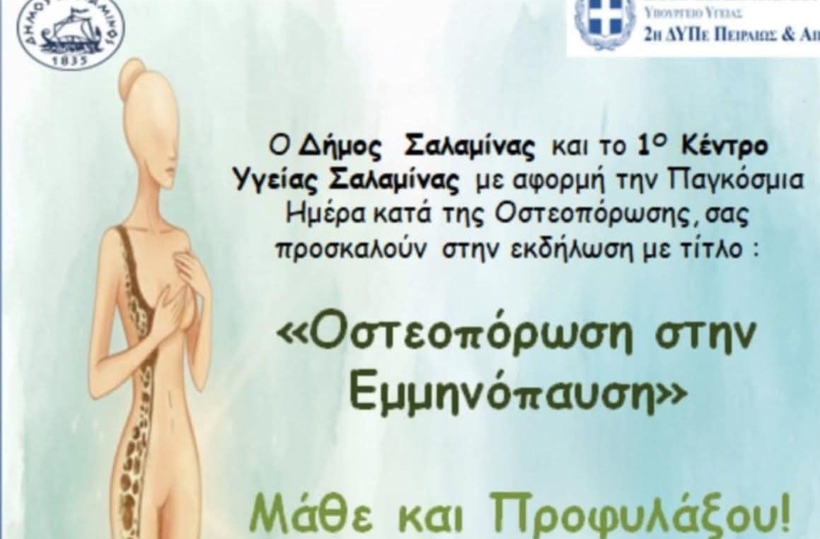 Μια σημαντική δράση ενημέρωσης και πρόληψης για την υγεία των γυναικών πραγματοποιείται στη Σαλαμίνα με αφορμή την Παγκόσμια Ημέρα κατά της Οστεοπόρωσης. Ο Δήμος Σαλαμίνας και το 1ο Κέντρο Υγείας Σαλαμίνας διοργανώνουν την εκδήλωση με τίτλο «Οστεοπόρωση στην Εμμηνόπαυση», σε συνεργασία με τα ΚΑΠΗ του Δήμου και τους πολιτιστικούς συλλόγους Λύκειο των Ελληνίδων (παράρτημα Σαλαμίνας), Σύλλογο Κατοίκων Κέντρου «Ο Άγιος Μηνάς» και τον Σύλλογο «Ο Καραϊσκάκης».