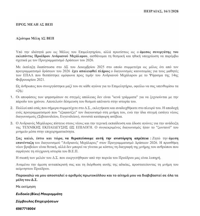 - Όπως αναφέρει, στο Διοικητικό Συμβούλιο του Δεκεμβρίου 2025 –στο οποίο ήταν παρούσα ως μέλος– διαπιστώθηκε ότι στον προγραμματισμό δράσεων του Επιμελητηρίου για το 2026 δεν περιλαμβανόταν ο διαγωνισμός καινοτομίας στη μνήμη του Μιχάλαρου, που είχε θεσπιστεί ομόφωνα το 2021.