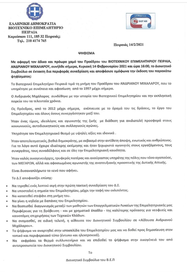 - Ζήτημα θεσμικής τάξης και σεβασμού στη μνήμη του αείμνηστου προέδρου του Βιοτεχνικού Επιμελητηρίου Πειραιά (ΒΕΠ), Ανδριανού Μιχάλαρου, θέτει με δημόσια παρέμβασή της η Βίκυ Μαυρομάτη, μέλος του ΒΕΠ και πρώην στενή συνεργάτιδα του εκλιπόντος.
