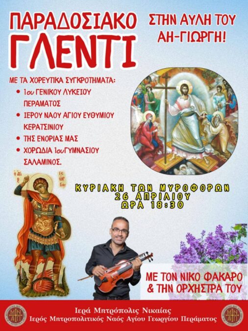 - Με λαμπρότητα θα εορταστεί ο Άγιος Γεώργιος στο Πέραμα, με αφορμή την πανήγυρι του Ιερού Μητροπολιτικού Ναού Αγίου Γεωργίου Περάματος (Λεωφόρος Δημοκρατίας 26), υπό την Ιερά Μητρόπολη Νικαίας.