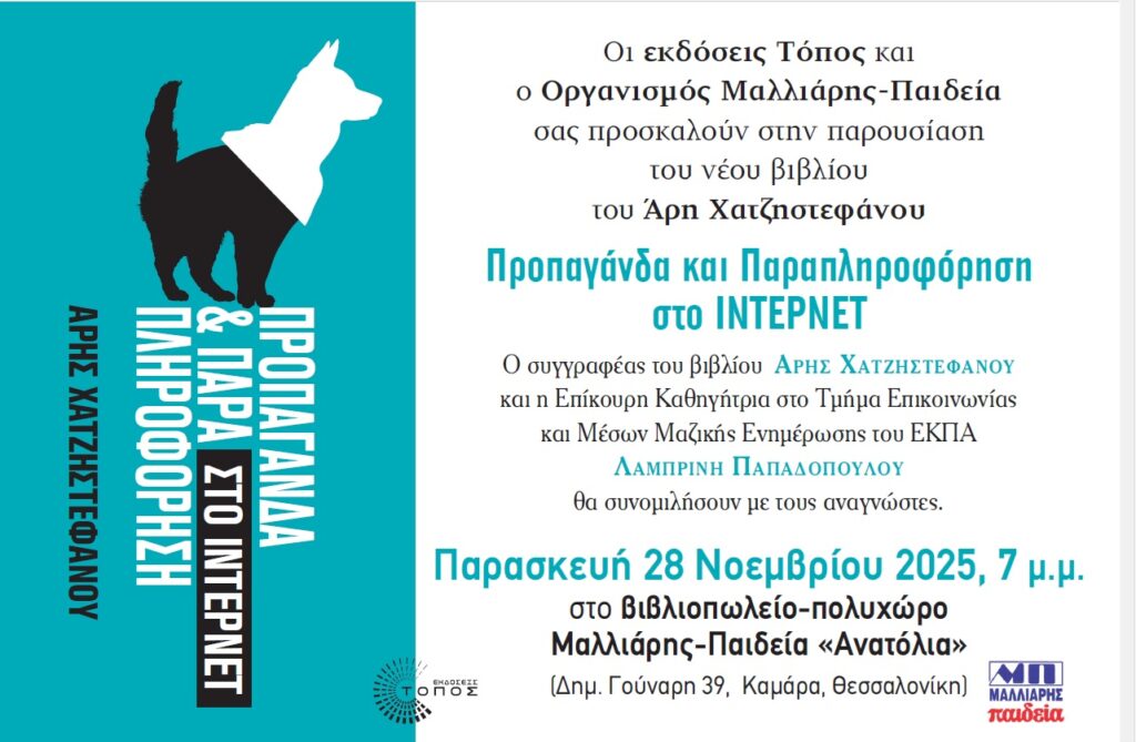 Μια ιδιαίτερα ενδιαφέρουσα εκδήλωση για όσους ασχολούνται με τα ΜΜΕ, την ενημέρωση και τη λειτουργία των αλγορίθμων στο σύγχρονο ψηφιακό τοπίο θα πραγματοποιηθεί την Παρασκευή 28 Νοεμβρίου στη Θεσσαλονίκη. Το νέο βιβλίο του δημοσιογράφου και σκηνοθέτη Άρη Χατζηστεφάνου, με τίτλο «Προπαγάνδα και Παραπληροφόρηση στο ΙΝΤΕΡΝΕΤ» (εκδόσεις Τόπος), θα παρουσιαστεί στις 7 μ.μ. στον Πολυχώρο Μαλλιάρης-Παιδεία “Ανατόλια” στη Δημ. Γούναρη 39, στην Καμάρα.
