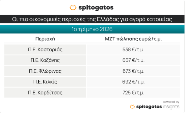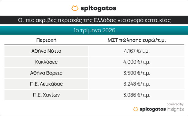 Τα Νότια Προάστια και οι Κυκλάδες παραμένουν οι ακριβότερες περιοχές της χώρας, με τιμές πώλησης έως και 4.167 ευρώ/τ.μ., ενώ ακολουθούν τα Βόρεια Προάστια, η Λευκάδα και τα Χανιά. Στον αντίποδα, οι πιο οικονομικές περιοχές εντοπίζονται σε περιφερειακές ενότητες όπως η Καστοριά, η Κοζάνη και η Φλώρινα, με τιμές που ξεκινούν από 538 ευρώ/τ.μ.
