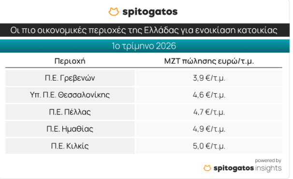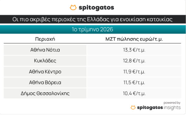 Στην ενοικίαση, τα Νότια Προάστια και οι Κυκλάδες βρίσκονται επίσης στην κορυφή, με τιμές άνω των 13 ευρώ/τ.μ., ενώ πιο προσιτές επιλογές καταγράφονται σε περιοχές όπως τα Γρεβενά και η Πέλλα. Στην Αττική, περιοχές όπως το Πέραμα, οι Αχαρνές και το Καματερό συγκαταλέγονται στις πιο οικονομικές, ενώ καταγράφουν παράλληλα αυξητική τάση.
