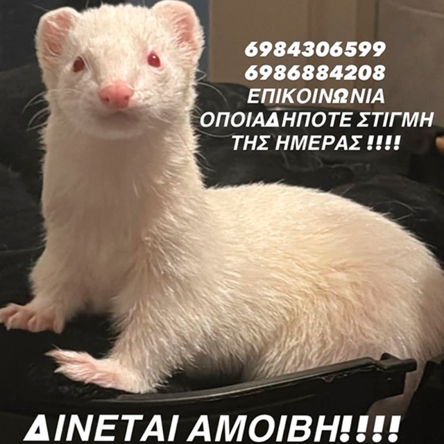 • Αγωνία επικρατεί στη Νίκαια για ένα οικόσιτο αλμπίνο φέρετ που χάθηκε, με την ιδιοκτήτριά του να απευθύνει έκκληση για βοήθεια, καθώς το ζώο δεν μπορεί να επιβιώσει μόνο του.